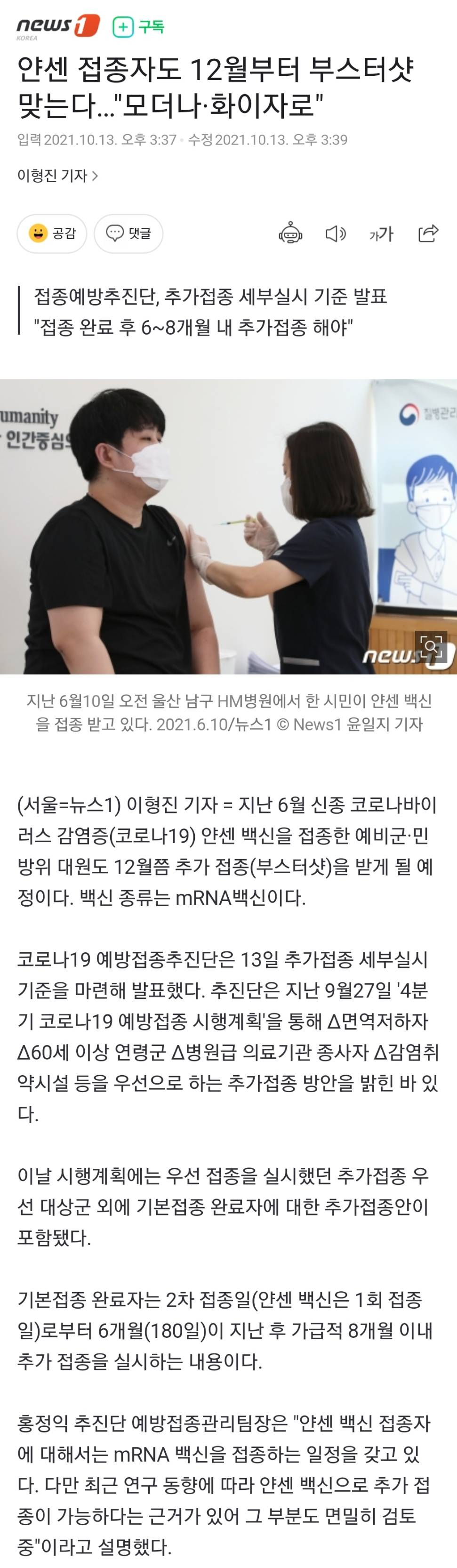 난 좀 지켜볼래. 부스터샷은 좀..음..게다가 얀센->화이자라서 더 망설여짐