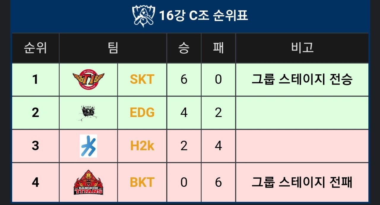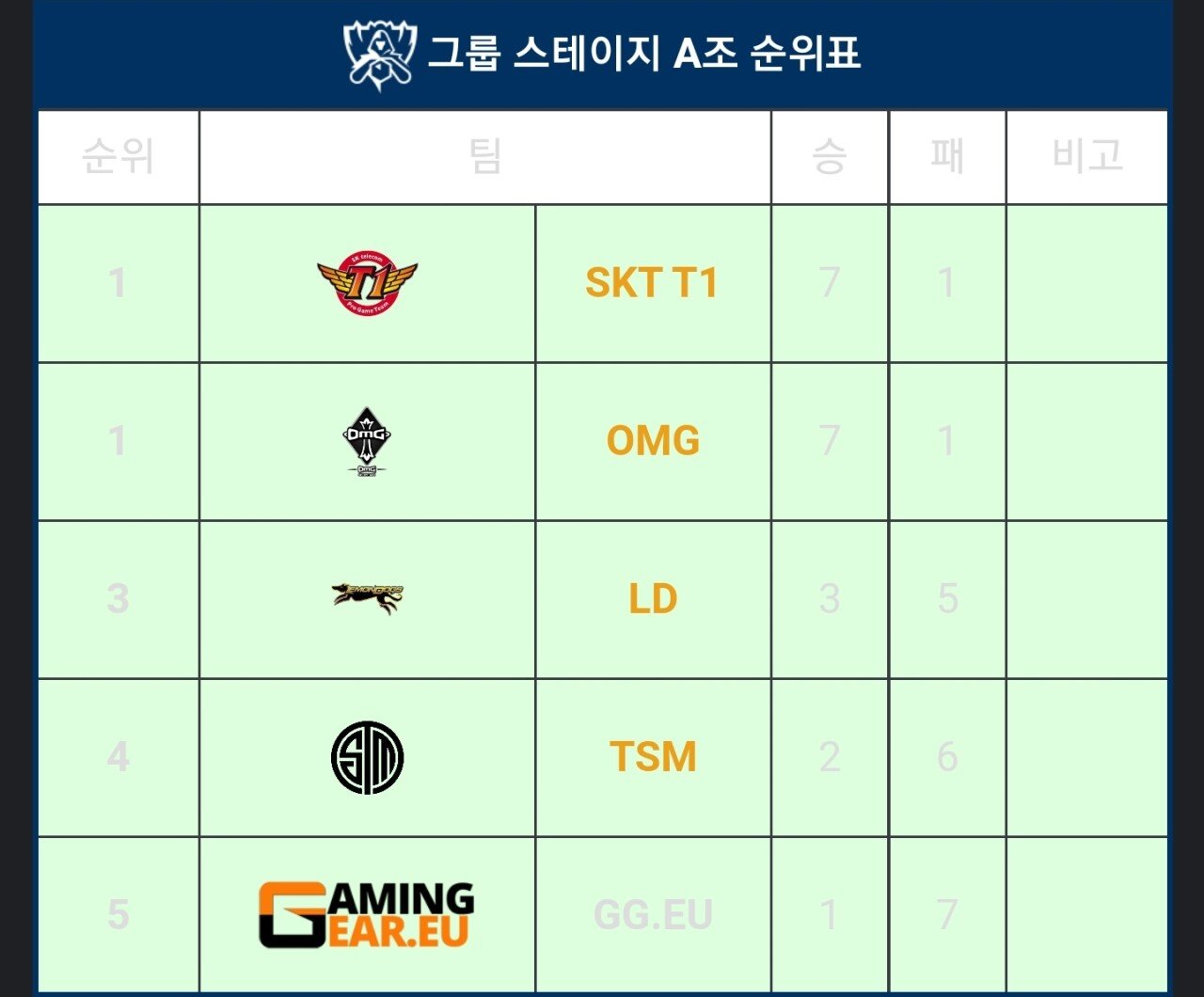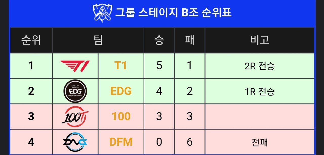 T1이 100도둑의 고추가루로 1위를 하게 되면서 롤드컵 6회 진출 내내 조별리그 1위라는 기록을 달성.