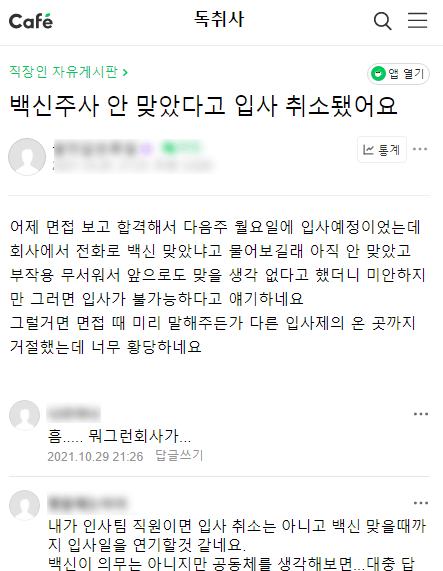 회사가 잘못한건 맞는거 같은데 아얘 첨부터 공고를 백신 맞은사람만 뽑는다고 하던가 면접까지 다 봐놓고 나중에 백신땜에 캇하는건 사과해야할듯