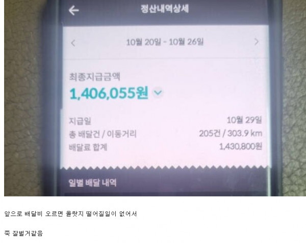 일주일 200건, 주6일이면 하루 33건 배달 하나에 평균 20분 잡으면 660분, 하루 11시간 노동 강도에 비하면 그리 많이 버는거 같진 않은데