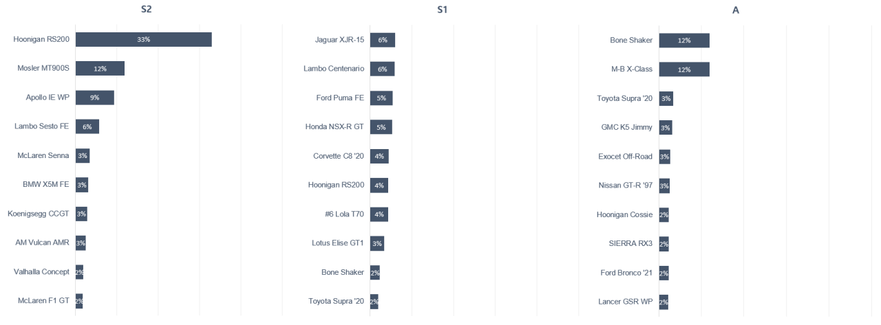 특히 HOONIGAN 1986 FORD RS200 EVOLUTION은 S1 등급에서도 상당히 사용 비율이 높습니다.