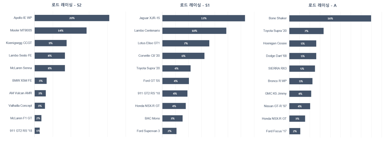 이제 로드 레이싱에서 차량 등급별 사용 비율 상위 10개를 봅시다.