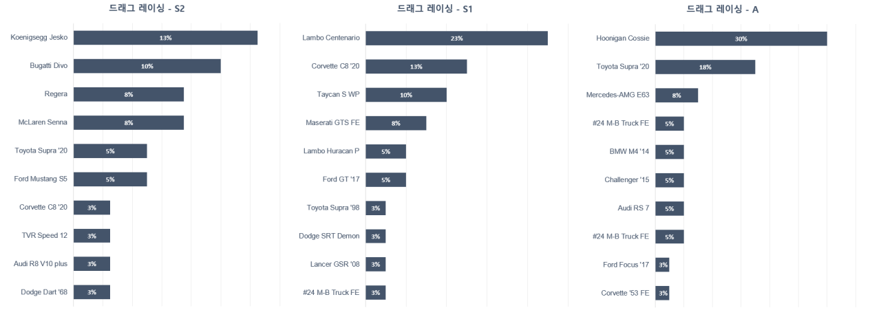 순으로 많이 사용되고 있지만 S2 등급과 다르게 압도적으로 많이 사용되는 차는 없습니다.