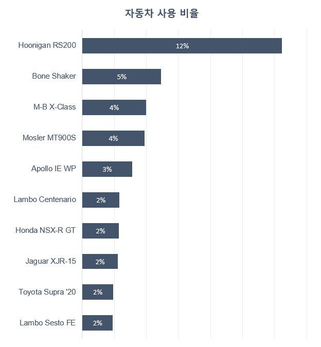 후니간사의 HOONIGAN 1986 FORD RS200 EVOLUTION이 4,800개의 데이터에서 12%를 차지하면서 1위