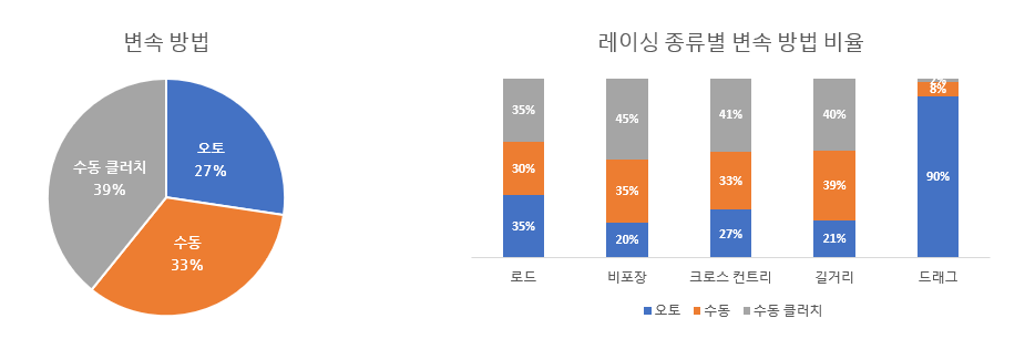 로드 레이싱 1,260개 데이터 중 오토 35%, 수동 30%, 수동 클러치 35%