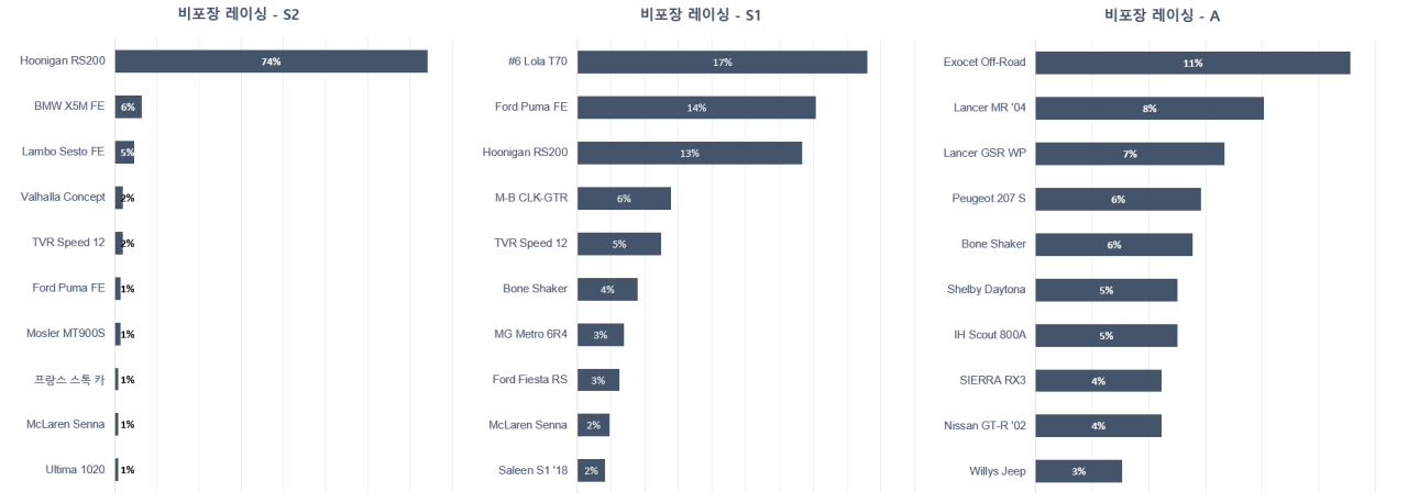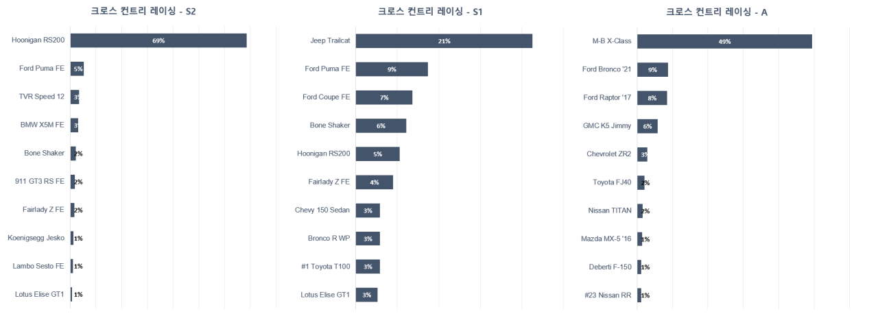 크로스 컨트리 레이싱은 각 등급마다 1개의 차량의 선호도가 압도적으로 높습니다.