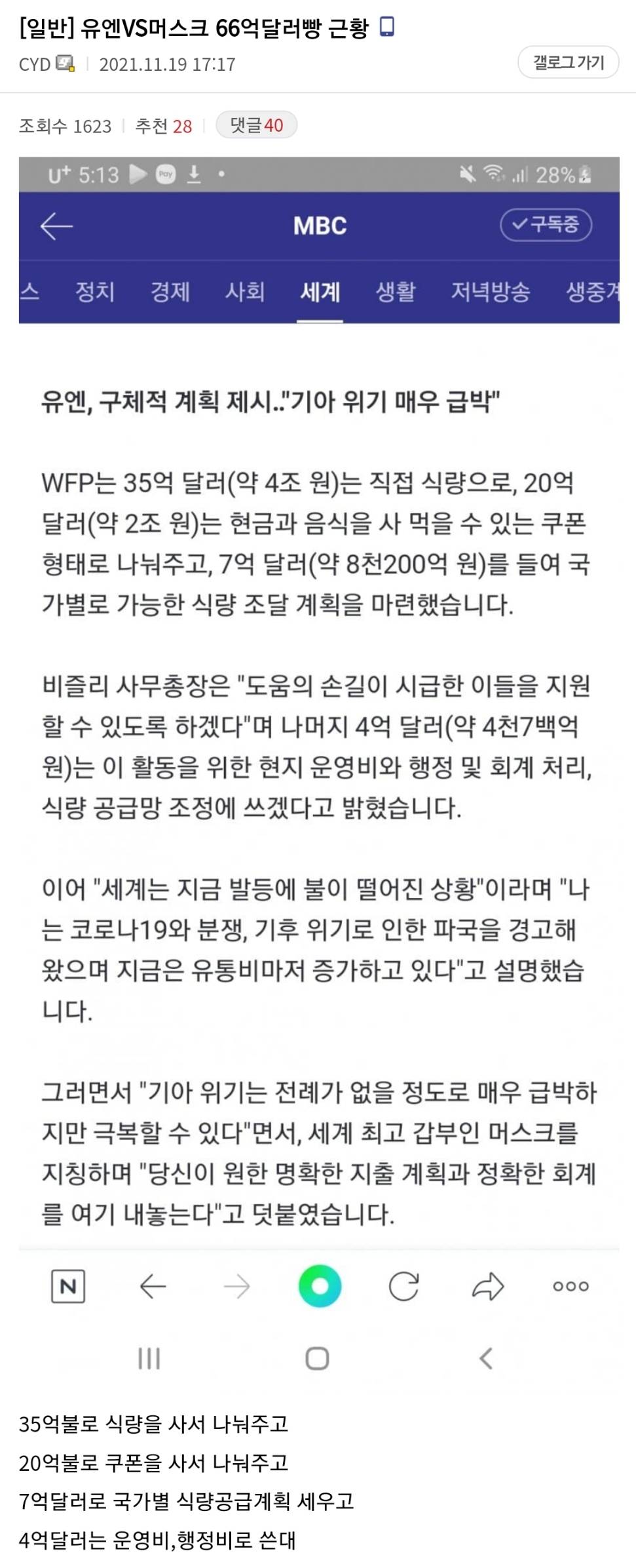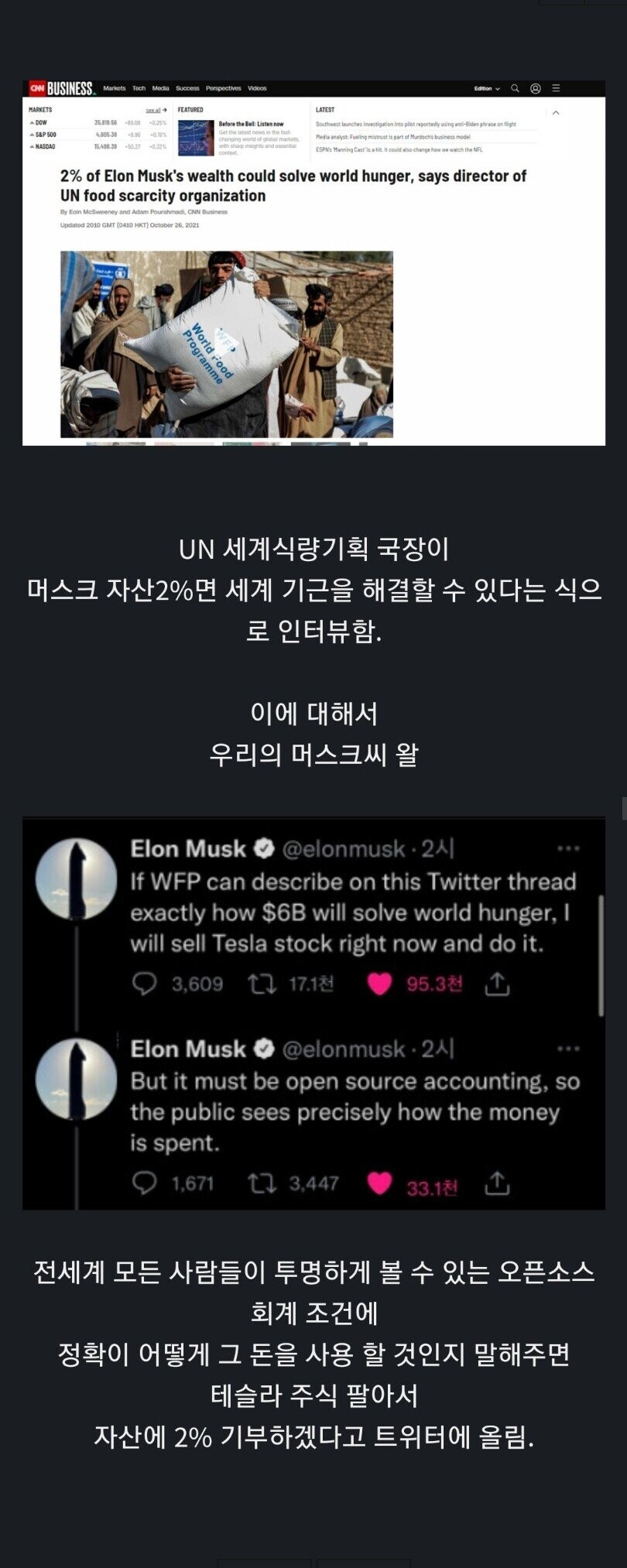 UN이 졸렬한게 2프로 재산기부하면 식량난 해결가능하다고 돈내라고했는데 일론이 해결방안 말하면 준다니깐 2프로재산주면 2022년의 식랑난을 해결할수있다고 말바꿈