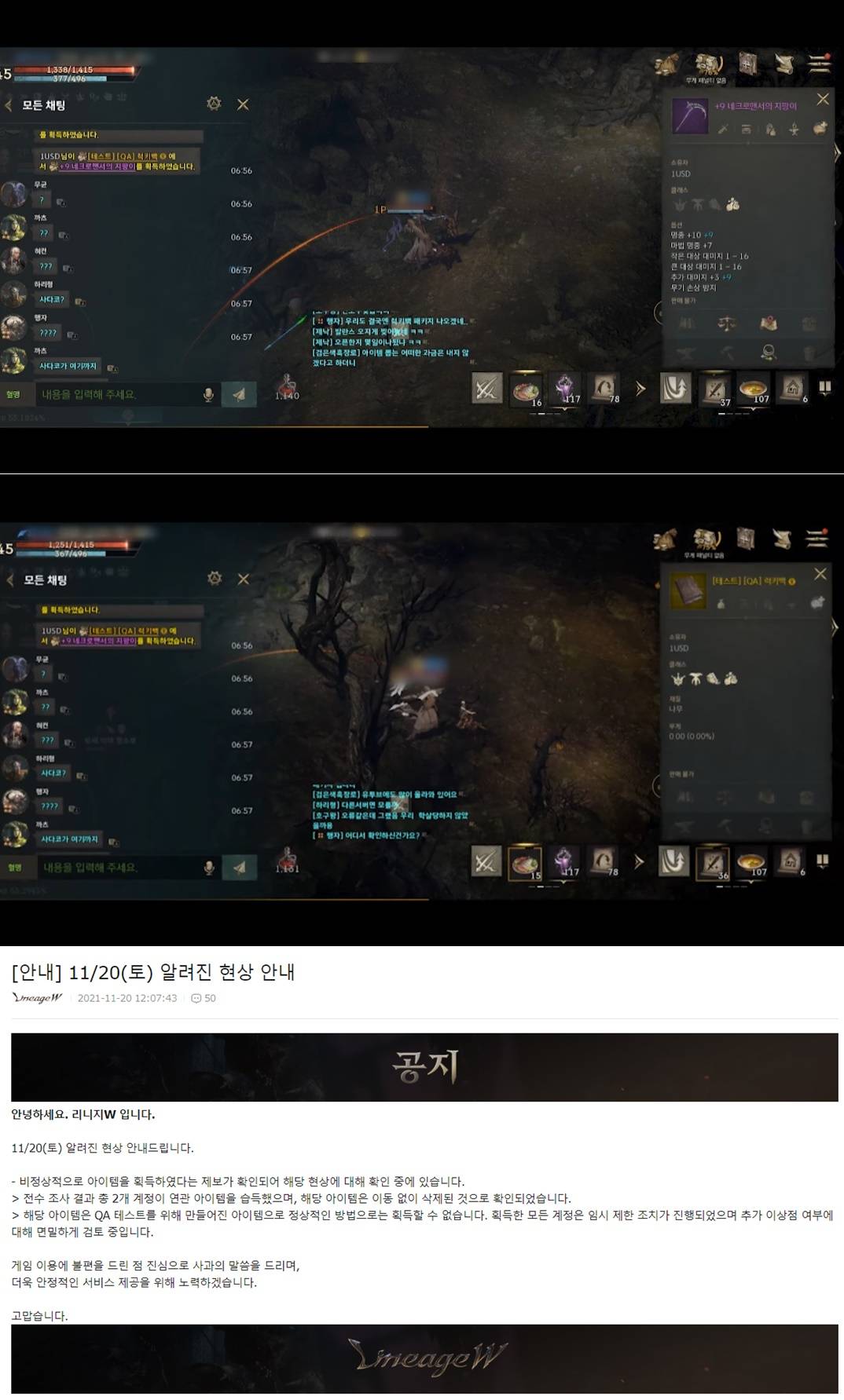 게임상에 존재하지 않는 지존템을 사다코라는 유저가 강화성공했다고 시스템메세지에 뜬 사건임