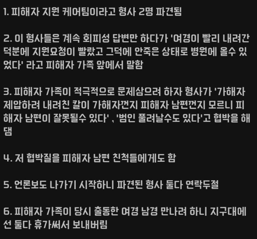 저거 출동나간 병신같은 년들 신상 안뜨나 빨리? 직무 유기해서 남 인생 조져놨으면 지들도 조져야지.