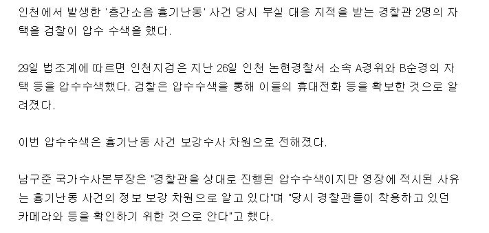 29일 법조계에 따르면, 인천지검은 지난 26일 인천 논현경찰서 소속 A 순경과 B 경위의 자택 등을 압수수색했다.검찰은 압수수색을 통해 이들의 휴대전화 등을 확보한 것으로 알려졌다. 검찰 관계자는 "압수수색 여부 및 관련 내용은 확인해 줄 수 없다"고 말했다.