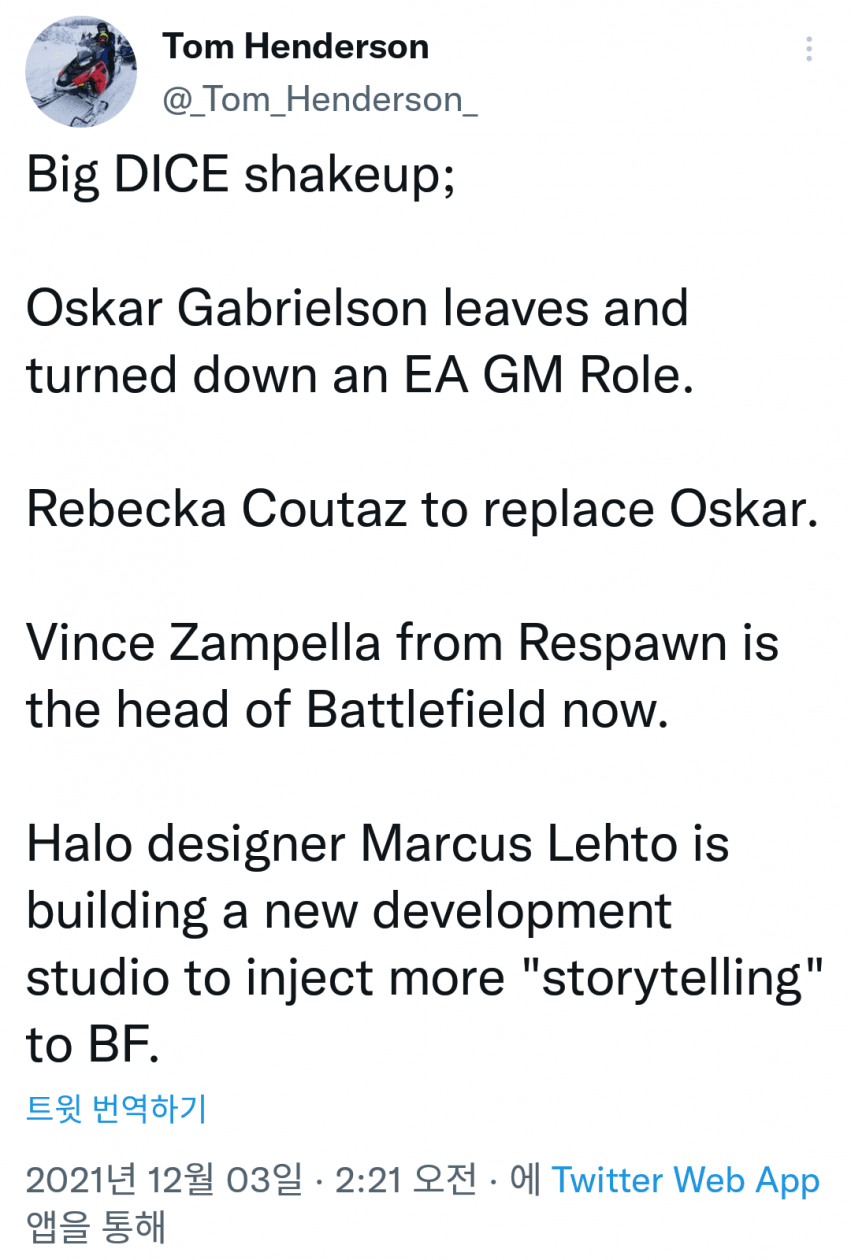 리스폰 빈스 잠펠라가 배틀필드도 같이 총괄 매니지먼트하고