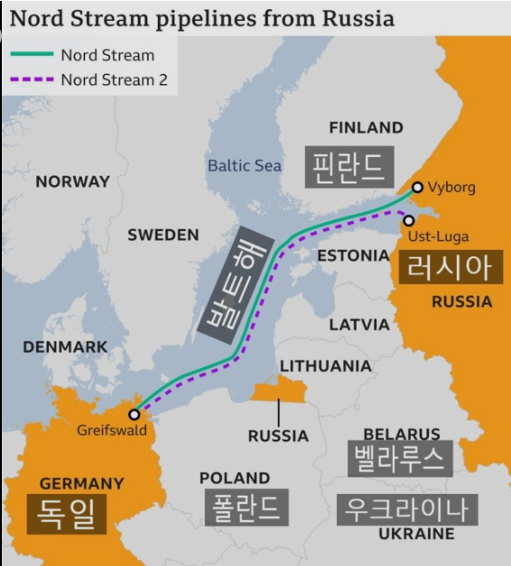 42. 노르드스트림은 우크라이나를 통과하지 않고, 발트해 바다속으로 천연가스 파이프라인을 묻어 천연가스를 독일로 공급하는 코스임.