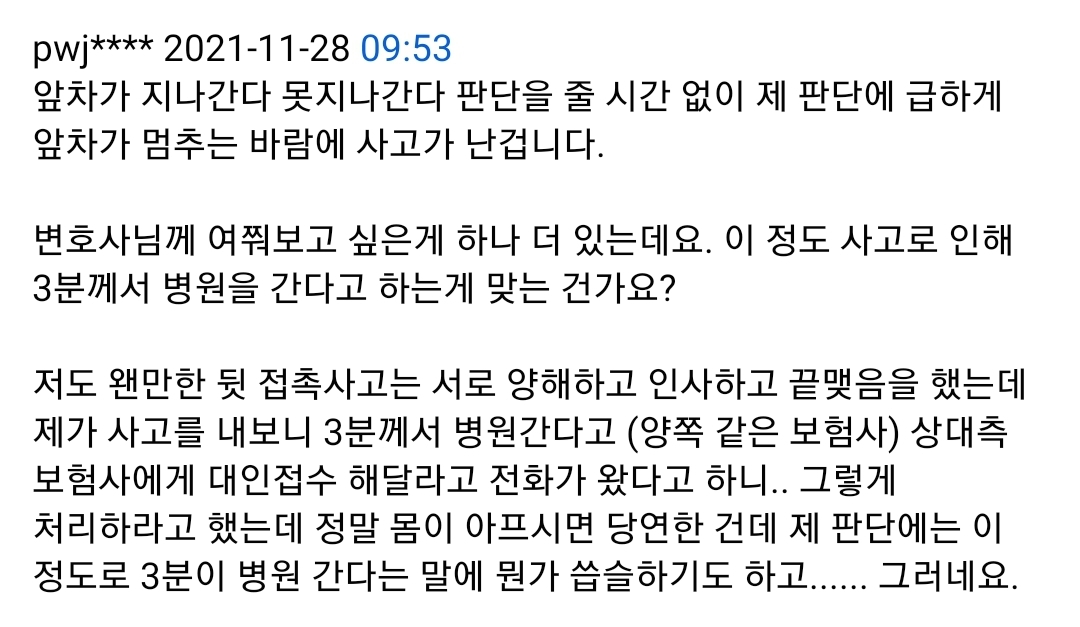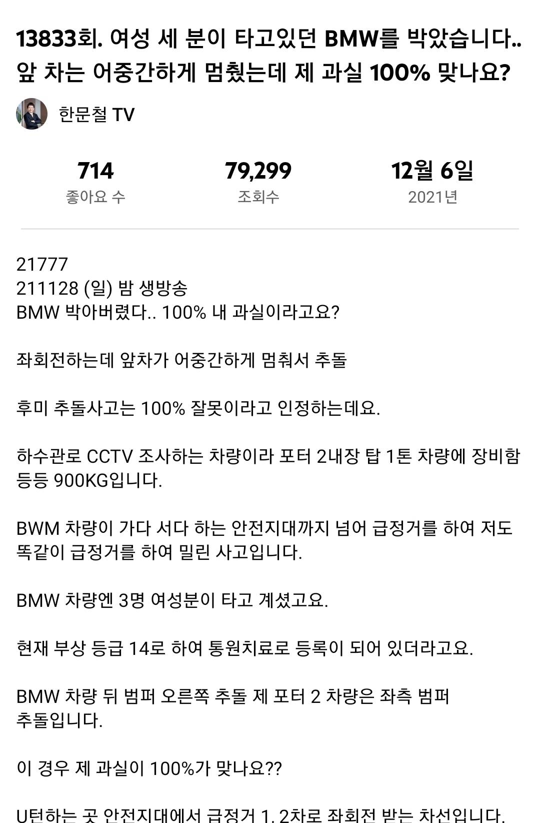 정지선에 진입후에 황색등이 들어오면 신속하게 주행 그 전에 노란불 들어오면 멈추는게 맞음 보통은 황색신호면 급하게 안 멈추고 적색신호 들어오는 타이밍 맞춰서 빠질사람은 빠지고 멈출사람은 멈추니깐 예상하기 힘들었을거라보는데 100퍼 블박차 잘못임