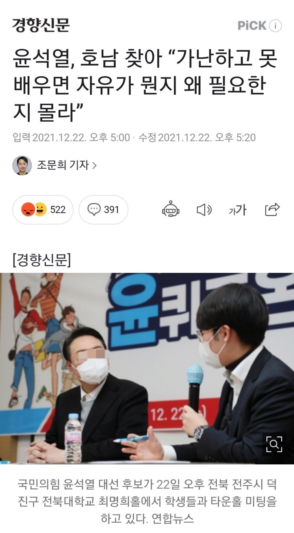 윤 후보는 22일 오후 전북대학교에서 열린 대학생들과의 만난 자리에서 '99개가 달라도 정권교체라는 하나의 뜻만 같으면 같이할 수 있다고 했는데 자유주의 정당이 차별금지법과 n번방방지법 등 자유를 침해하는 사람과도 할 수 있다는 말인가'라는 한 학생의 질문에 "자유 본질은 일정한 수준의 교육과 기본적인 경제 역량이 있어야만 존재하는 것"이라며 이렇게 말했다.