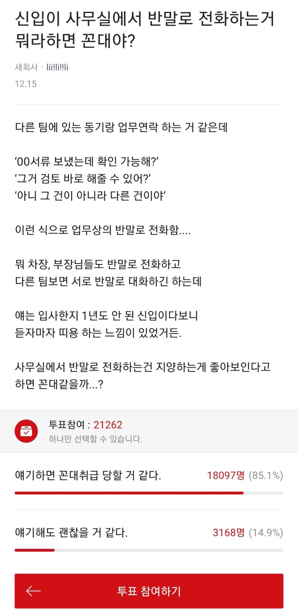 동기끼리 직위차이없으면 반말이지 심지어 직위차이나도 둘의 친분에 왜 제3자가끼어들어 설혹끼어들어서 회사내규상 반존대로 하라고 해도 꼰대는 맞아 아니 애초에 남의전화를 왜듣고있어?