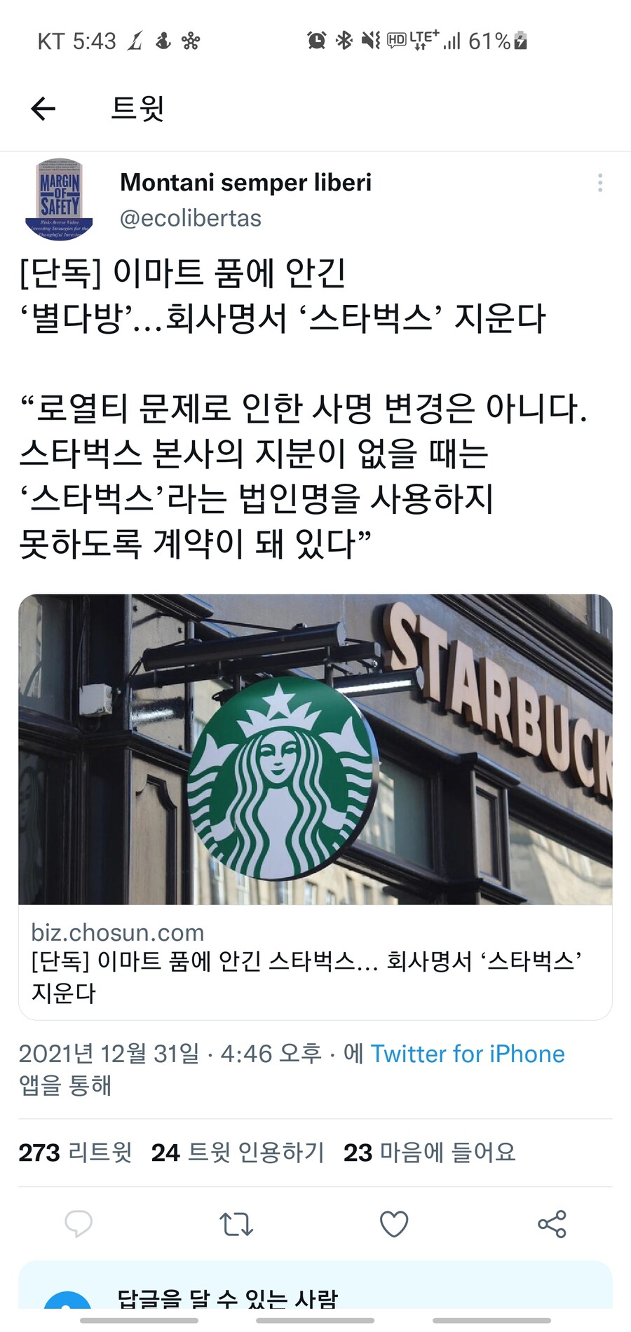 스타벅스 가게 이름은 쓰는데 법인명이 스타벅스코리아 이름이 바뀐다는거임