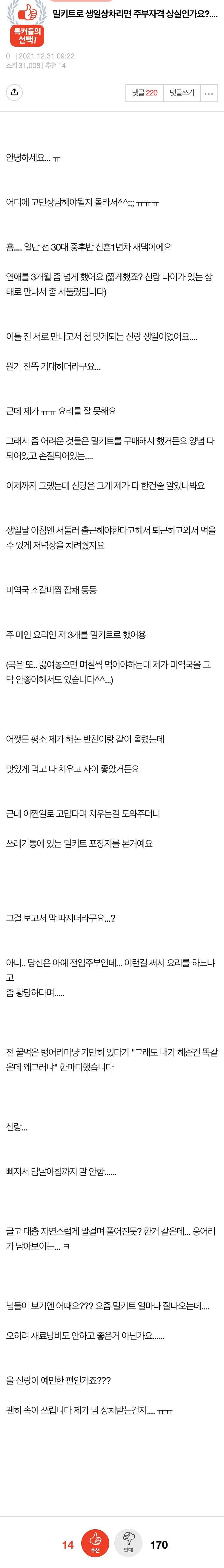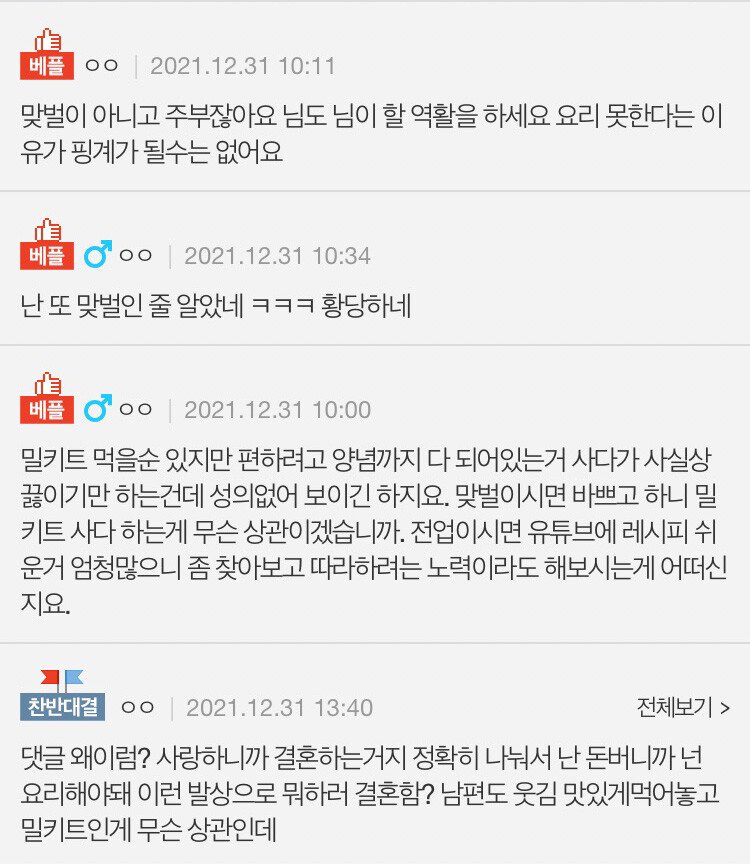 글 내용에서 요즘 밀키트가 얼마나 잘나오느니, 재료 낭비도 안하고 좋냐느니 말 하는 거 자체가 나는 되게 이상한 소리라는거임