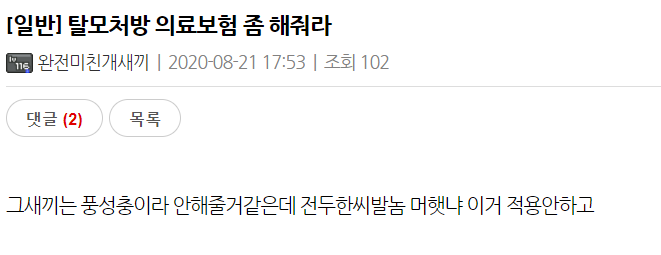 이걸 칭찬하는 사람이 있다? 너는 꼭 탈모약 잘먹어라 탈모인의 수치니까. 진정한 탈모인은 두피는 몰라도 두피 안은 건강하다.