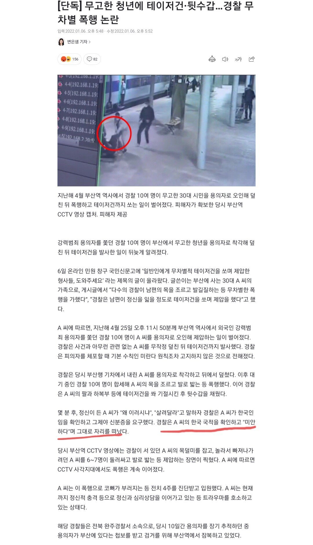 흉기 든 새끼 상대로는 도망가는 병신들이 일반인 상대로는 일단 테이저 쏘고 CCTV 없는 구석 끌고가서 폭행함 잘못을 했으면 대가리박고 사과해야지 그냥 미안하다 한마디하고 가는게 맞는 대처인가? 이 개새끼들은 조리돌림을 오지게 해야하고 철밥그릇 깨버려야 됨