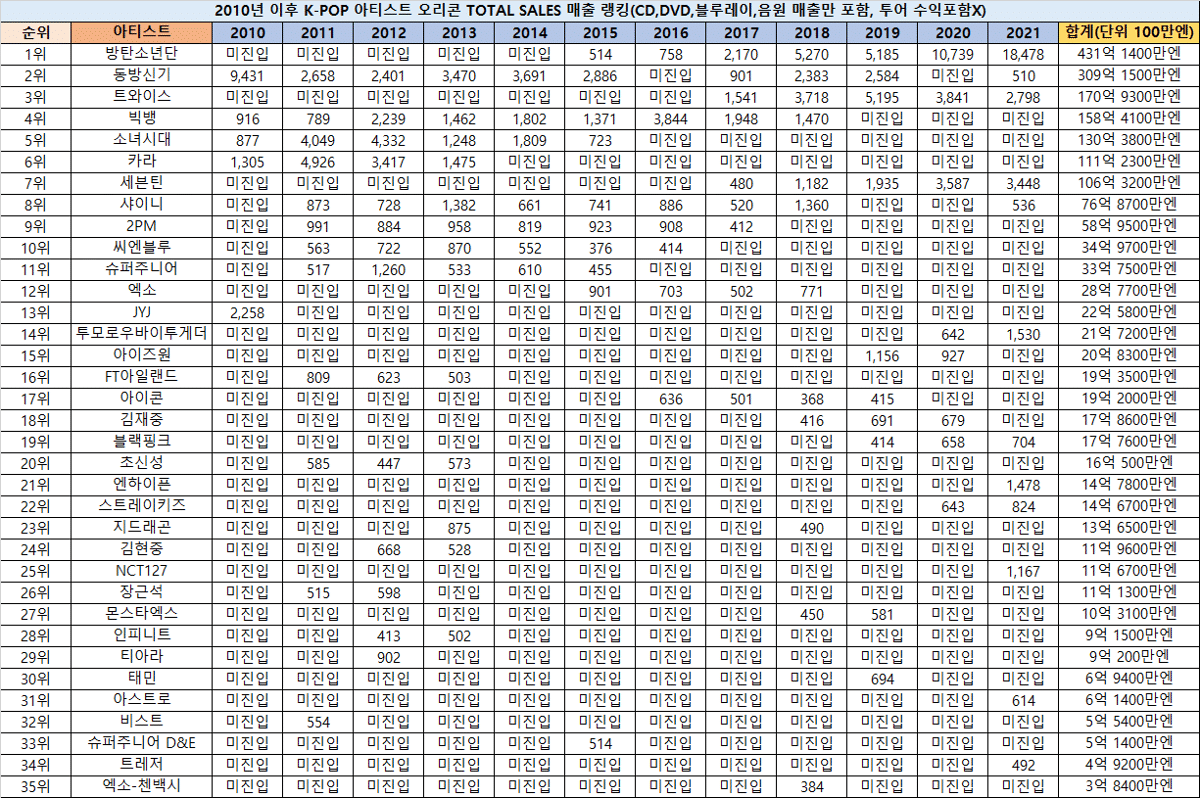 이건 공연 수익을 제외한 - 즉 cd, dvd, 블루레이, 음원 매출액 종합 기록.