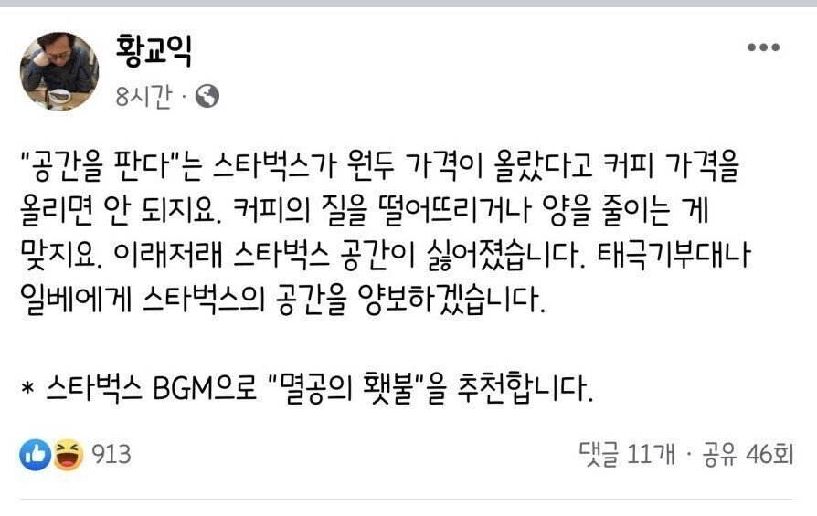 원두가격때문에 커피가격올릴바에 커피질이나 양을 떨구라는 병신같은소릴 어케 저리 당당하게하지 ㅋㅋㅋㅋ 대가리에 보톡스 꽂앗냐?