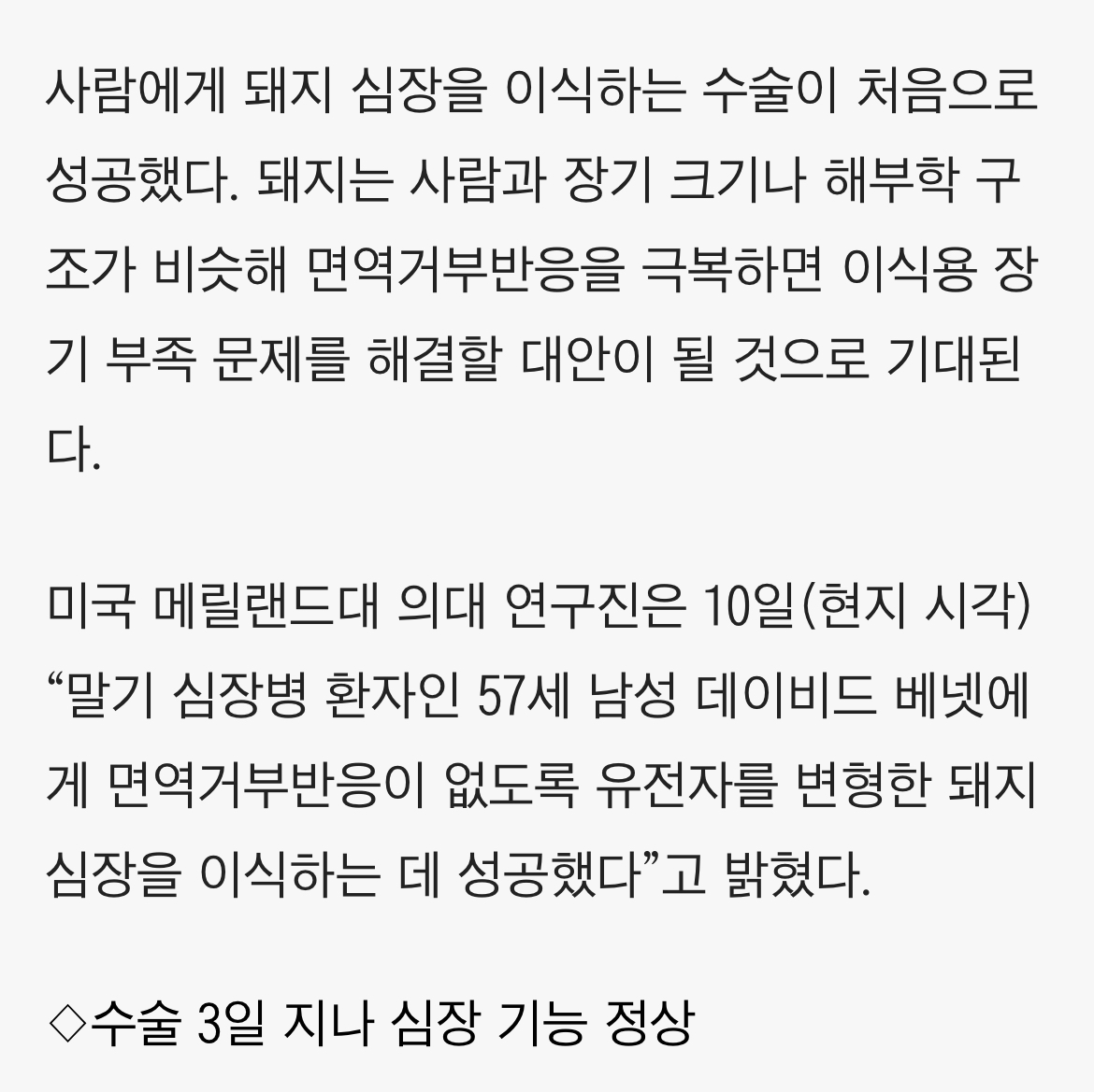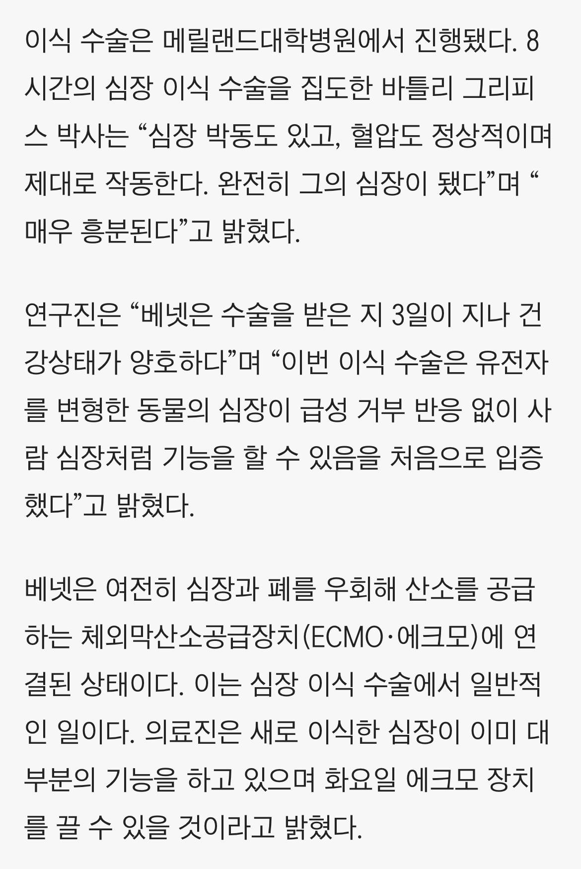 며칠전에 돼지 신장 체외에 이식한거 봤는데 불과 며칠만에 심장이냐 이게 돼지 유전자 커팅해서 면역반응 일으키는 유전자 조작해서 만든 돼지라며 사실 제일 확실한건 사람 장기겠지만 그건 도덕적으로 불가능하니 돼지를 새로 만들어서 장기 뺴쓰는거 같은데 일견 맞긴 한데 막상 장기용 사람 만드는거랑 크~~~게 차이나는건지 잘 모르겠다