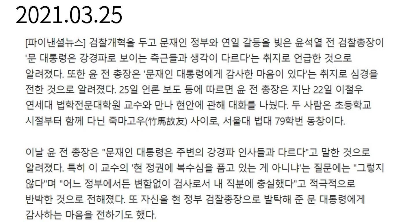 "검찰총장이 해야 할 중요한 일 중 하나가 정권이 무탈하게 갈 수 있도록 하는 것이고, 그러기 위해서는 문제가 될 수 있는 부분들을 애초에 정리해야 한다. 그런데 조국 사건을 살펴보니, 방치하면 정권에 막대한 타격을 줄 정도로 사안이 매우 심각했기 때문에 수사를 시작한 것."