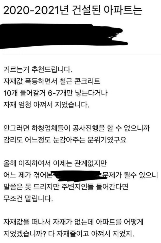 몇년전에 세종에 모아 아파트 철근 막 빼먹었는데 아무도 몰랐잖아 감리도 돈받고 눈감고 1군은 그래도 다르겠지 싶긴한데 또 이번에 현산 무너진거보면 모르지