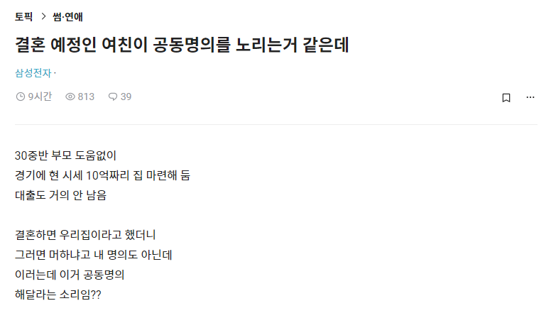 저건 여자가 미친년이지 가령 집에 대출이 4억이면 대출은 같이갚아야하지만 대출이 거진없으면 공동명의를 왜해줌? 솝박말대로 취득세만물어야하는데