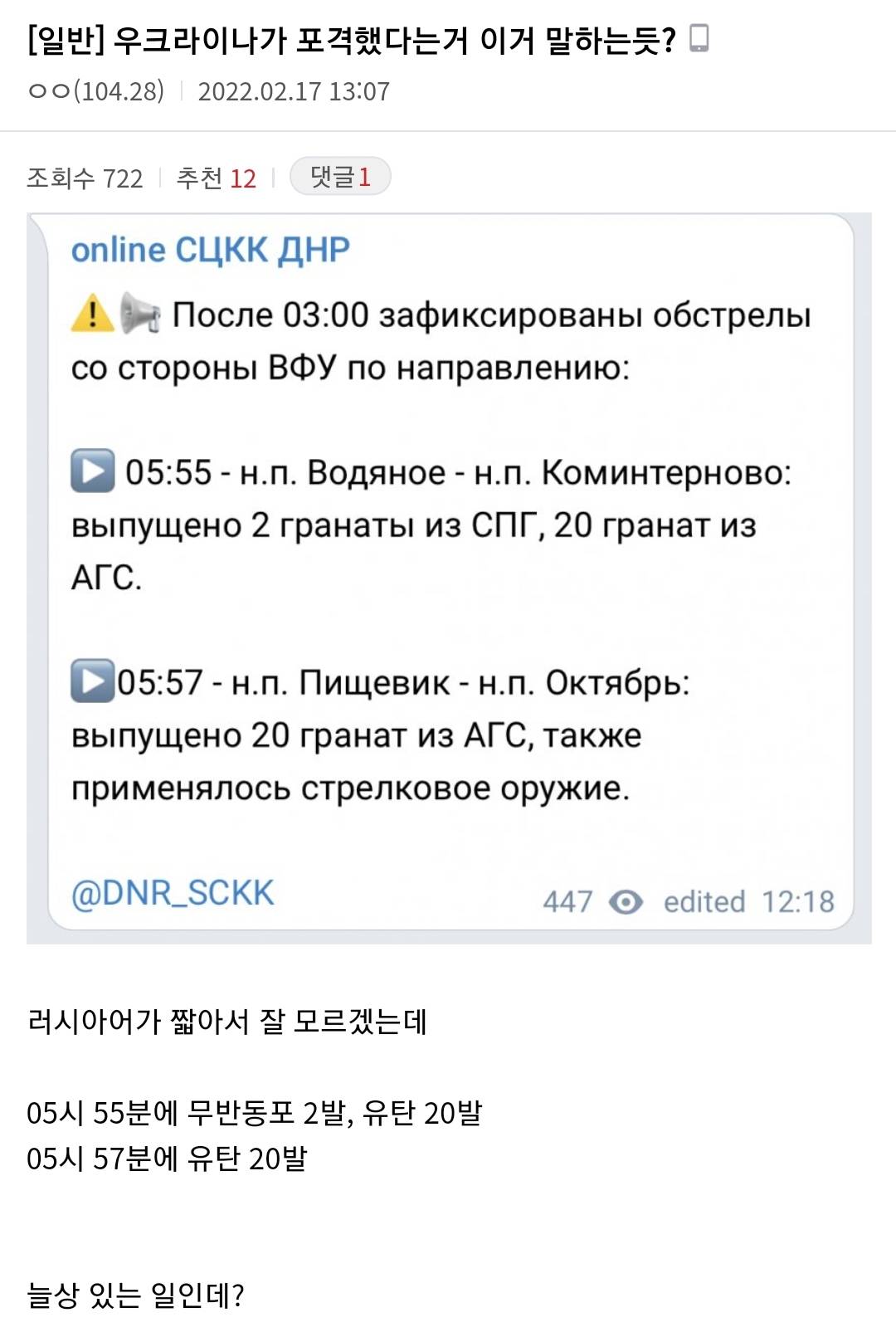 그리고 보도한 언론이 러시아에서 잘 안쳐주는 곳이래서 잘안믿는 눈치인가봄