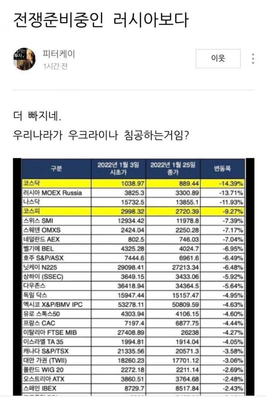 나스닥 존나빠지고 우리나라도 존나빠지길레 세계적으로 빠지는줄 알았는데 딱 우리랑 미국만 빠졌던거야?;;;
