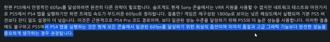 플스는 VRR이 없으니 다른전략으로 접근해서 플스4 하위호환 버전으로 구동하면 자글자글거리는 해상도와 낮은 그래픽옵션을 봐야하지만 60프레임은 보장됨