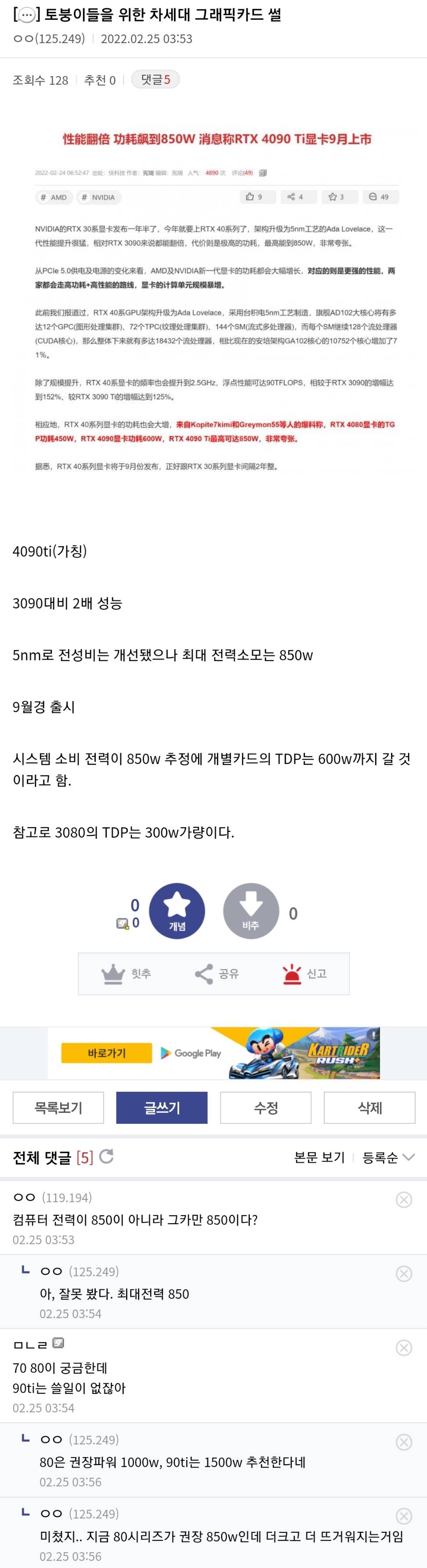 글카 단일로 850? 전성비 나오는 적당한 성능 좀 나왔으면 좋겠다 성능 올라가는것도 좋지만 ㅅㅂ 전력 너무 쳐먹잖아