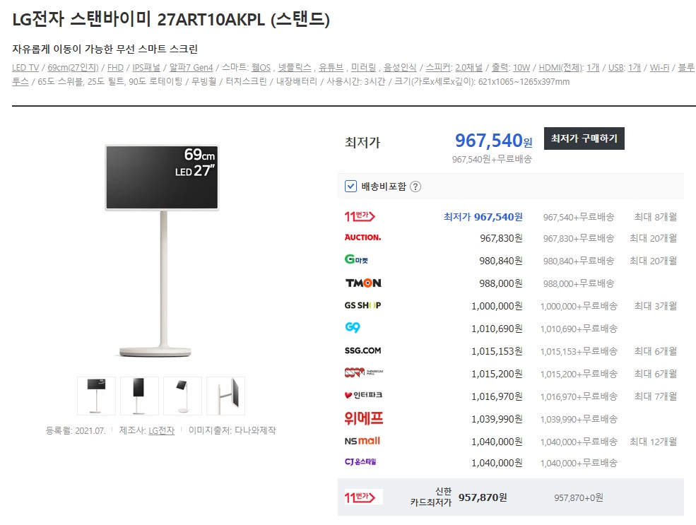 이거 생산단가가 높아서 안파는게 나은데 시험적으로 파는거라 언제 또 공급 끊길지 모름 27인치 FHD TV 로 접근하면 가성비 개똥망인데 27인치 태블릿이라 생각하면 가성비 나쁜것도 아님 당연히 터치되고 안드로이드 TV 앱들도 다 구동 됨 그럼에도 개인적으로는 저 정도 화면이면 터치해서 쓰는 거 보다 리모컨 쓰는게 훨 편해서 이동식 거치대에 TV 쓰는게 나을거 같지만 저거 산 사람들은 만족도 엄청 높더라