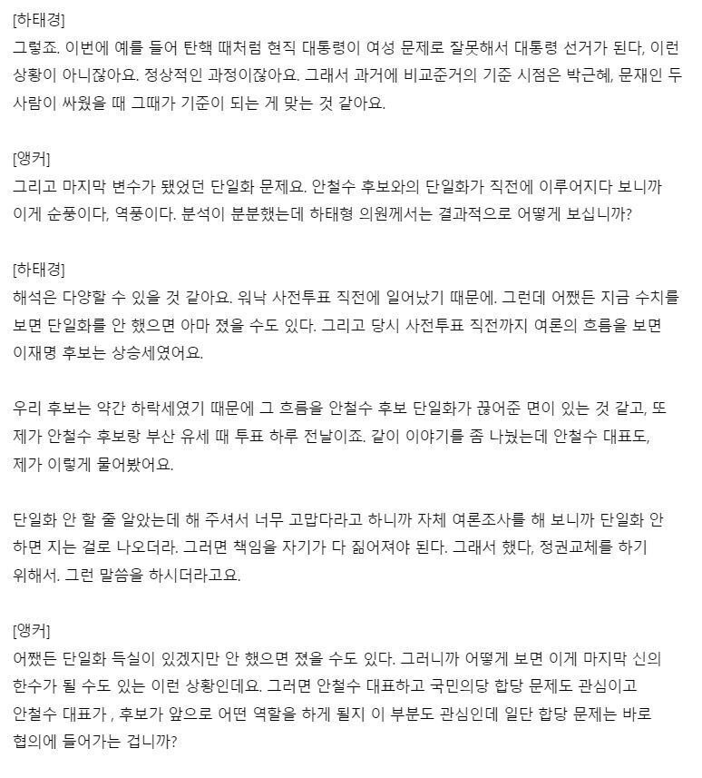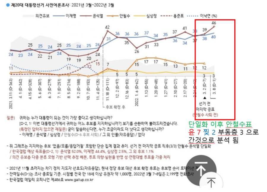 막판 단일화 이유 : 안철수쪽에서 자체 여조 돌렸는데 이재명이 이기는걸로 나와 정권교체 실패 가능성 높아서 단일화한거라함 근데 기가막히게 드러맞음 0.73%로 이김