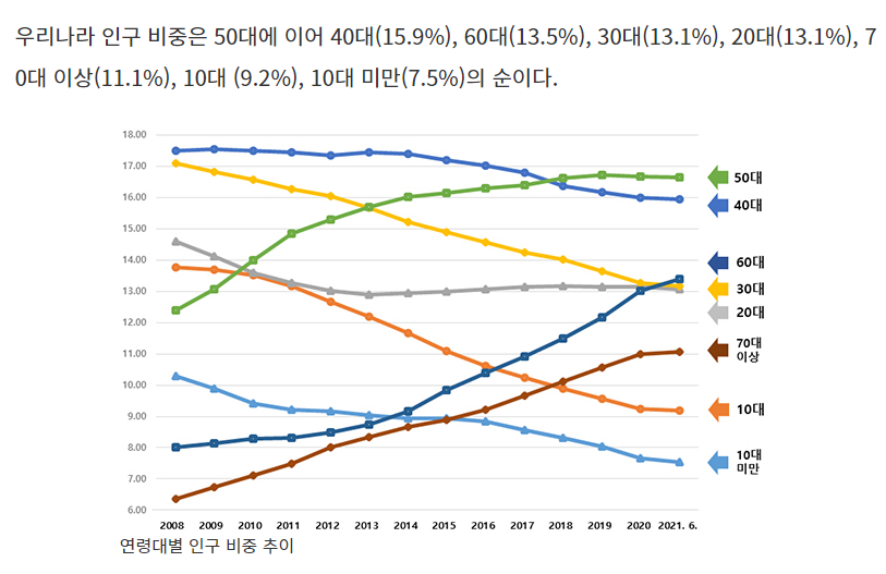 그리고 한편으로 60대 이상의 인구는 나날이 줄어들 수 밖에 없음. 40 50대는 앞으로도 10년 이상은 인구 크게 줄어들지 않고 50 60대로 올라가겠지.