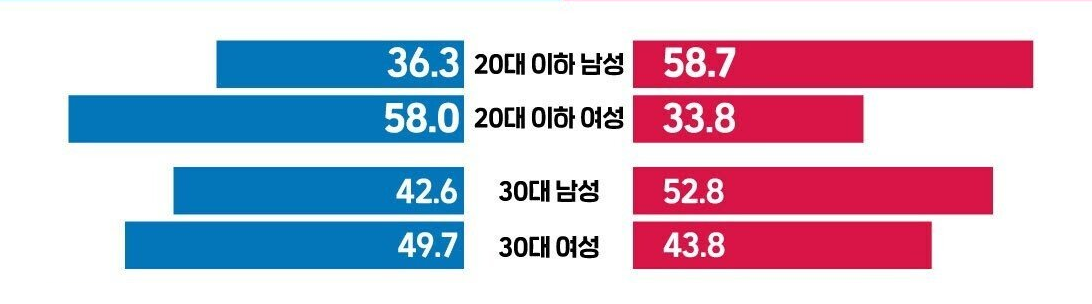 2030남자는 2030여자한테 인구수(투표율)도 밀리고, 지지율도 비슷함...