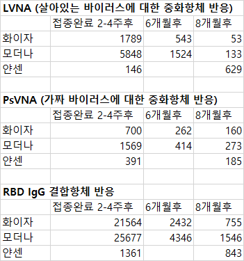 초창기 높은 수준의 항체가에서 시간이 지나면 급격히 감소하는 mRNA 백신에 비해 얀센백신은 시간이 지나며 오히려 항체가가 증가되는 결과도 나타났으며 감소폭 또한 좁게 나타남.
