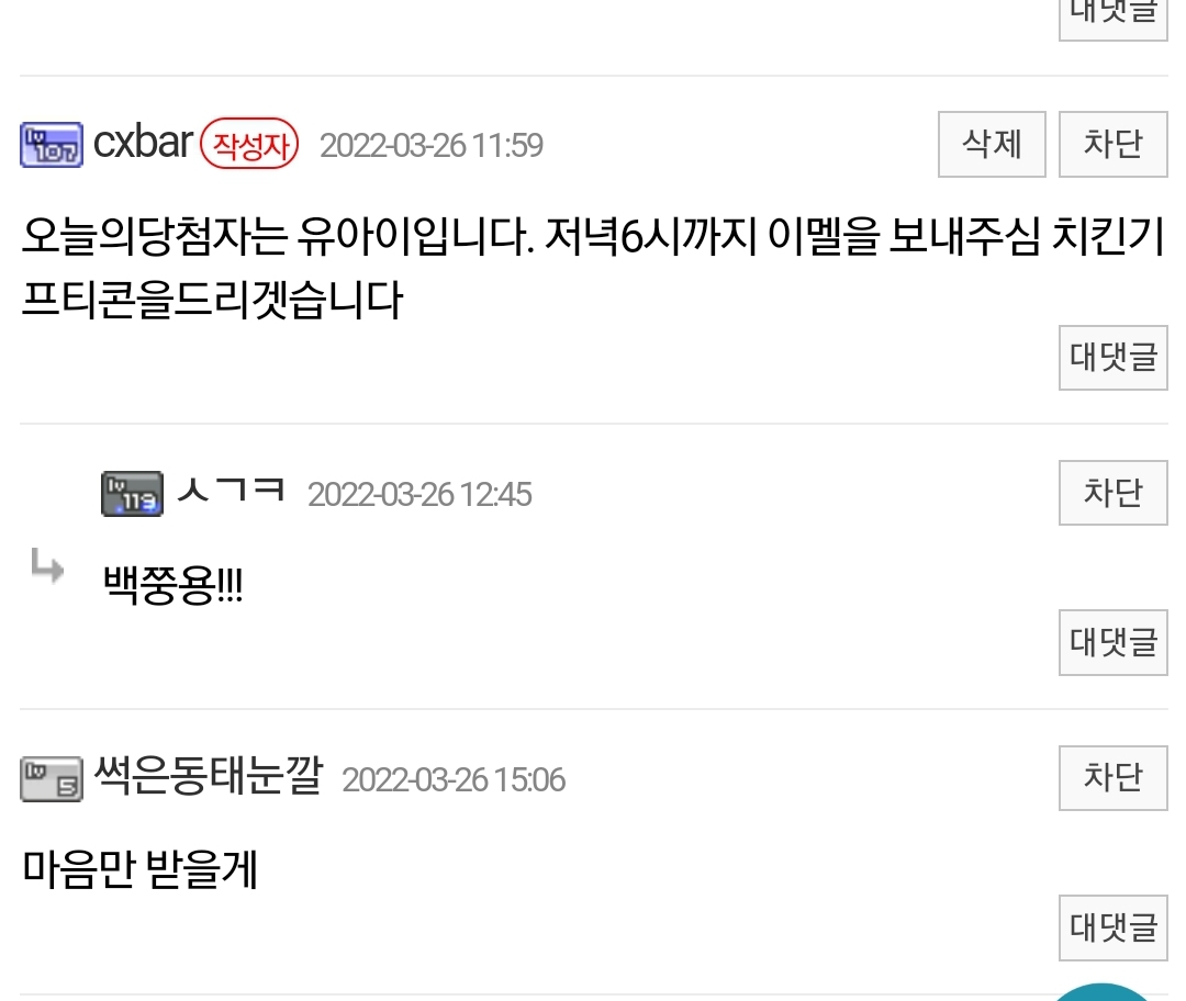 릴레이가 끊긴관계로 다음 치킨이벤트는 4월말에합니다.