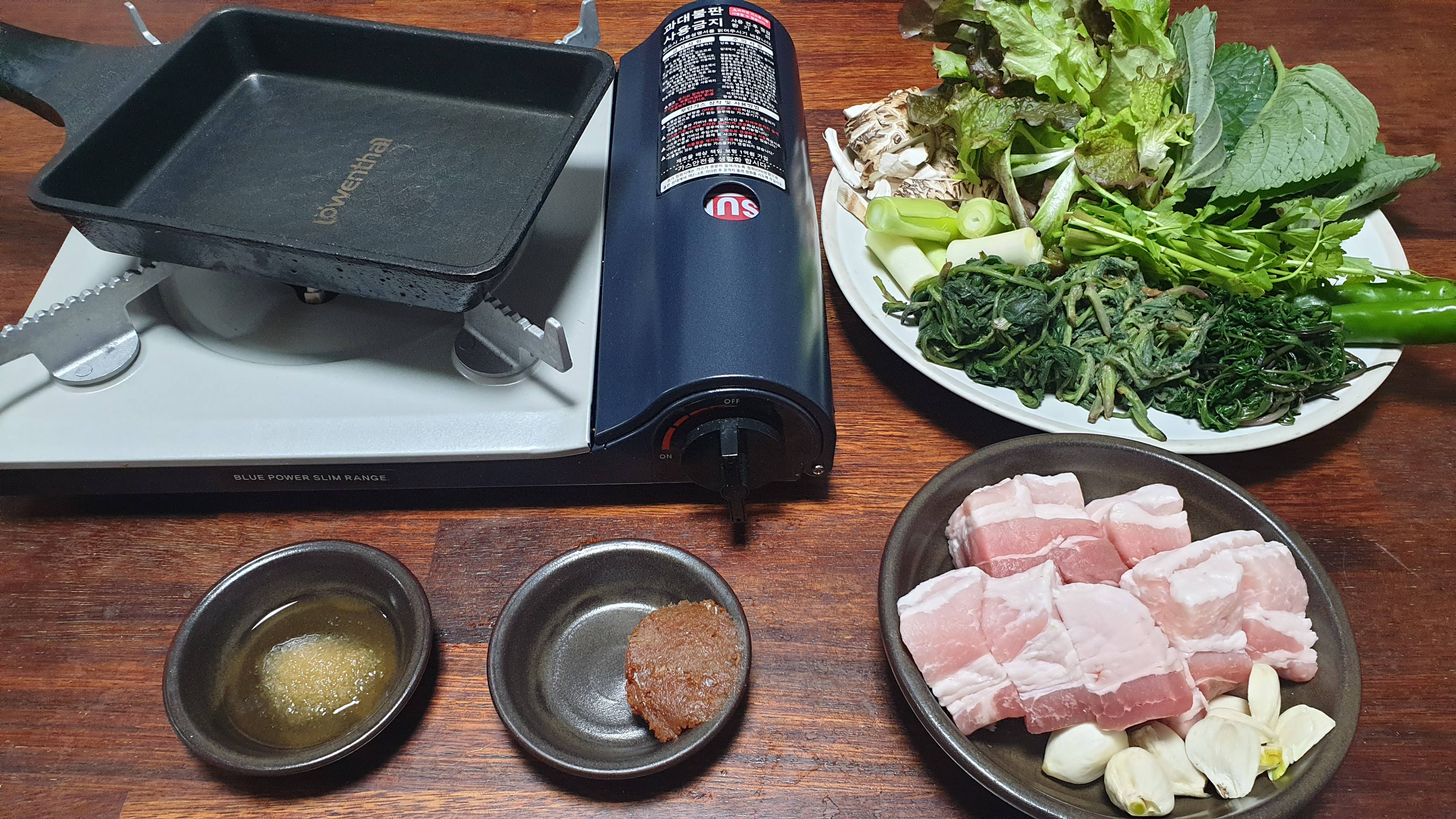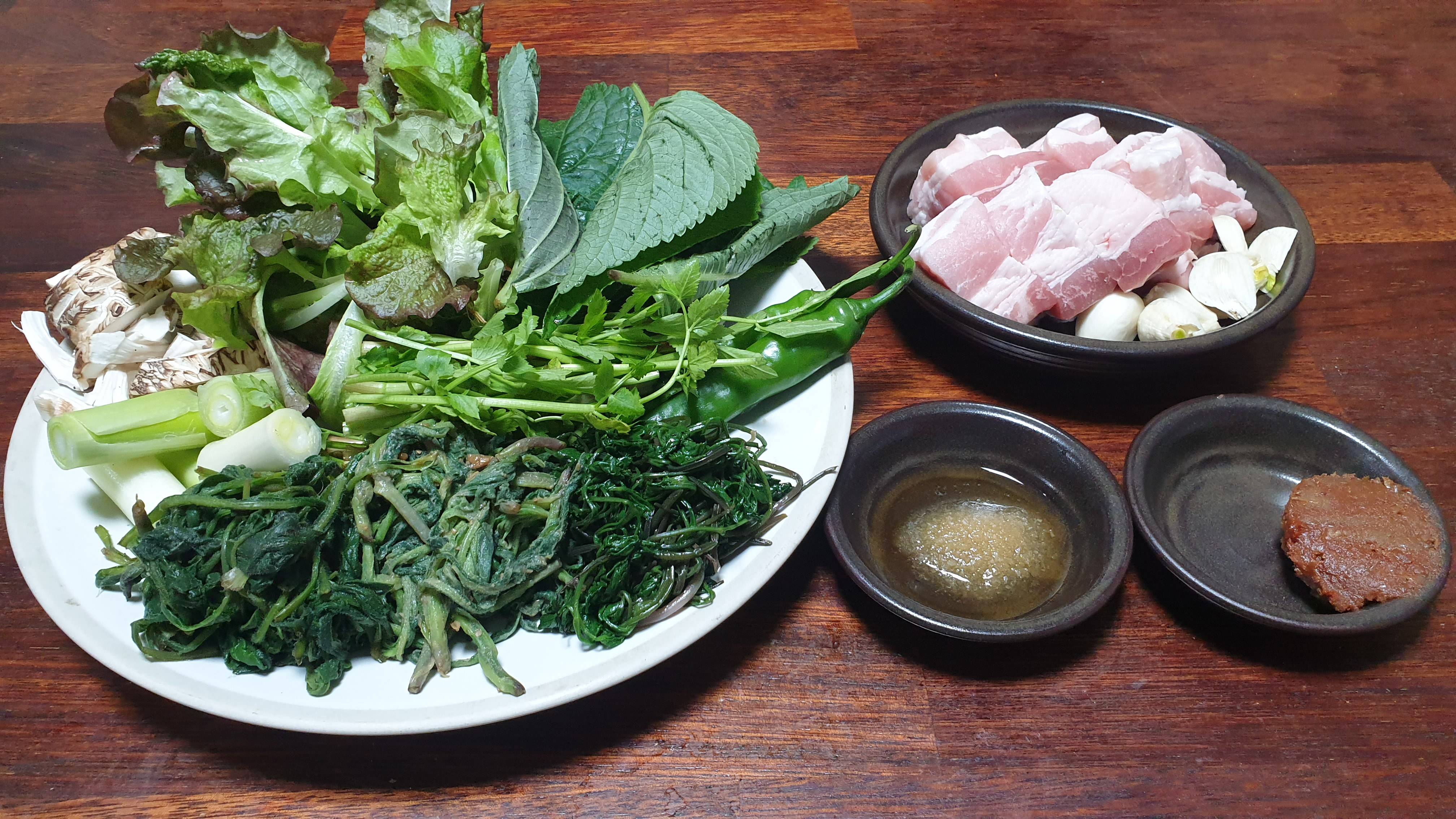 삼겹살 그리고 나물3종과 밭에서 갓따온 야채
