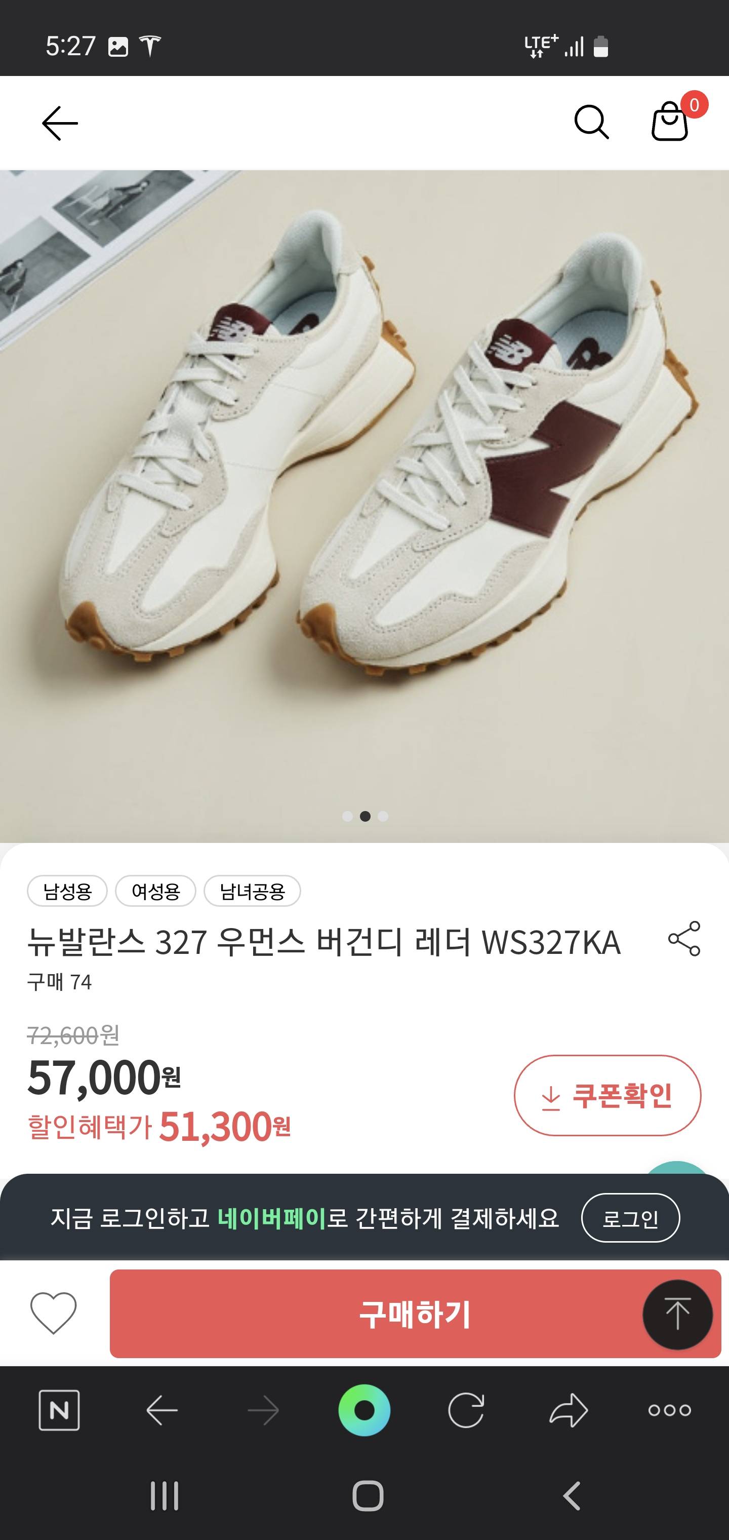 부모님 신으실꺼면 574가 낫다 327은 신발 밑창이랑 발바닥 폭차이가 심해서 발목약하면 큰일날수도..