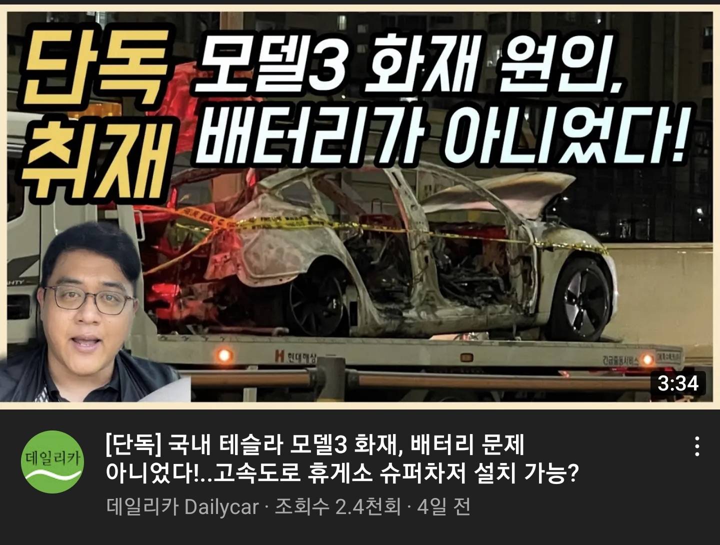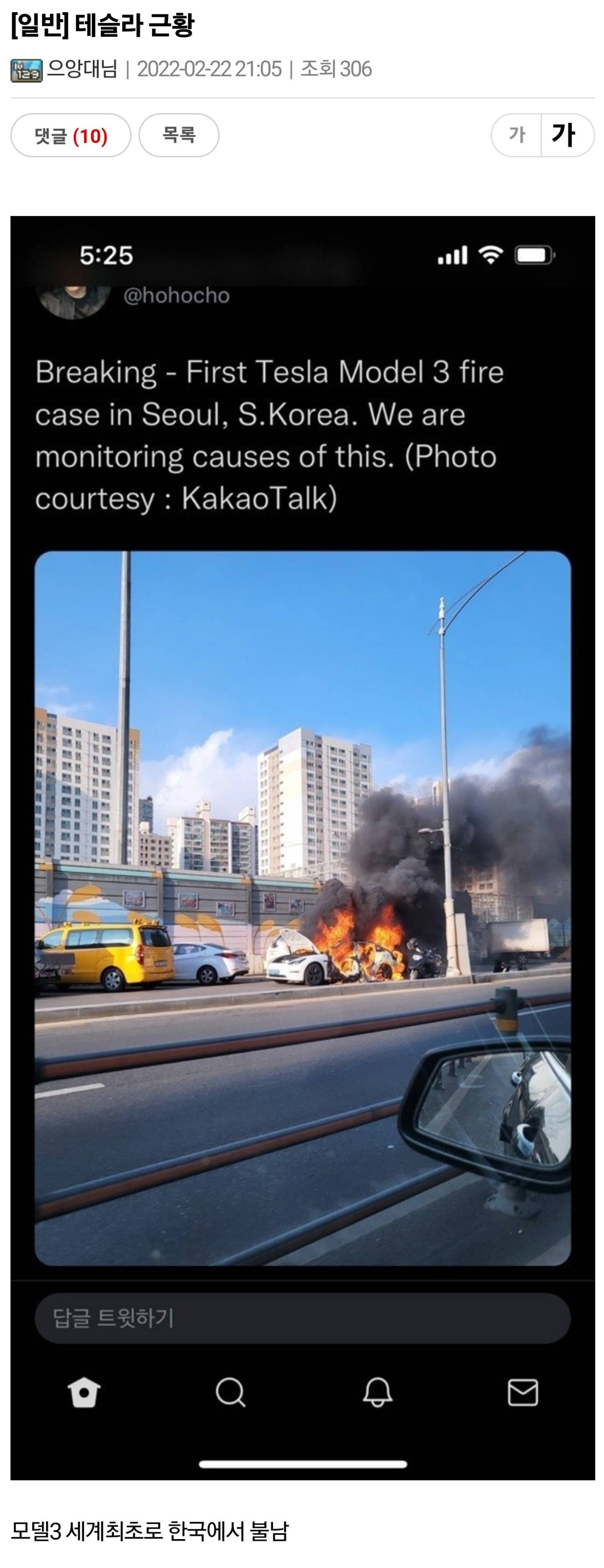 세계최초 모델3 화재로 기사났던 사건