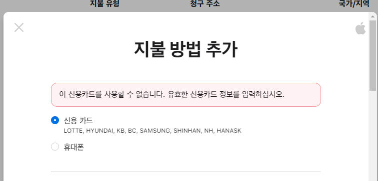 애플tv 구독때문에 회원가입하고 결제카드 등록하는데 자꾸 사용못하는카드라고 뜸