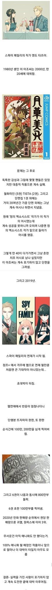 현재 스파이패밀리는 1600만부를 돌파했고 원나블 뒤를 잇는 삼대장 중의 한축이 되었다고 한다