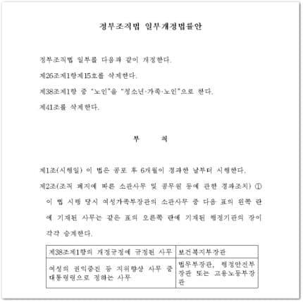 발의된 개정안은 정부조직의 '행정각부'를 정의한 제4장의 제26조 제1항제15호 '여성가족부'를 폐지하도록 명시했다.