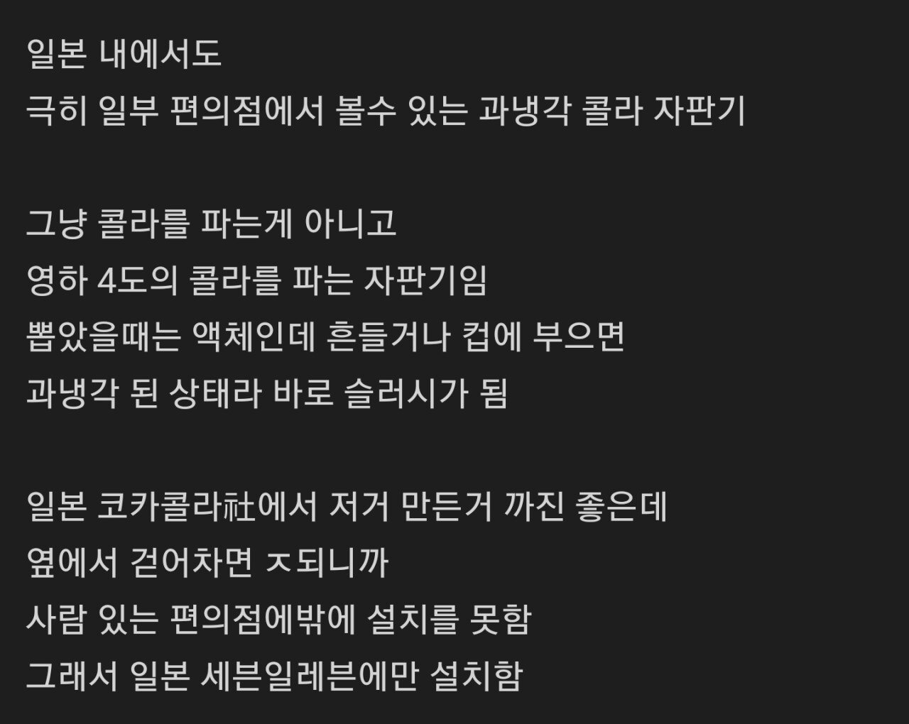 다른데 설명 글엔 과냉각 상태라 자판기에 충격 주면 망해서 사람 있는 실내에만 설치 가능(소수) 어차피 이걸 하려고 찾아 오는 사람들은 특별한 재미를 원하는거라 마케팅용으로 저런 시스템 했다고 함 맞는지는 몰루?