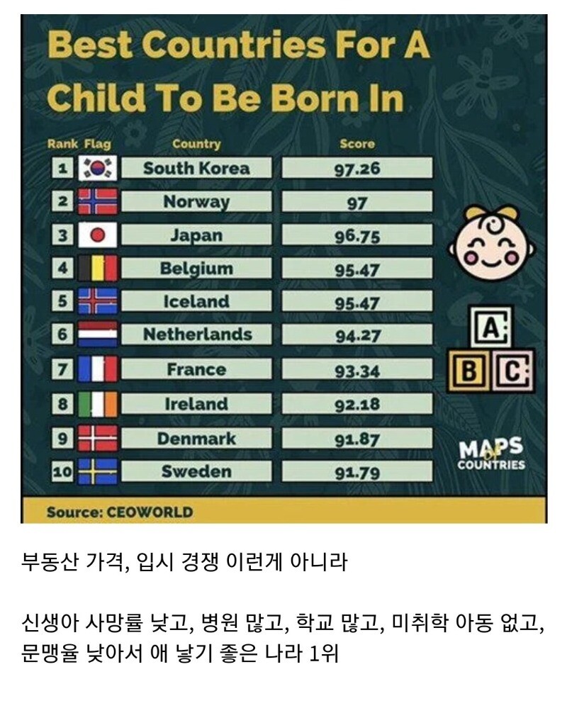 2. 인당GDP 3만불 국가라서 부모가 먹는 거 입는 거 노는 거 조이면 솔까 윗세대보다 풍족하게 아이 기르면서 살 수 있는 환경이 마련되어있지만(생각보다 애 키우는 데 돈 그렇게 많이 들지 않음), 이제 어른들은 아이에게 희생하면서 사는 삶을 원치 않음.