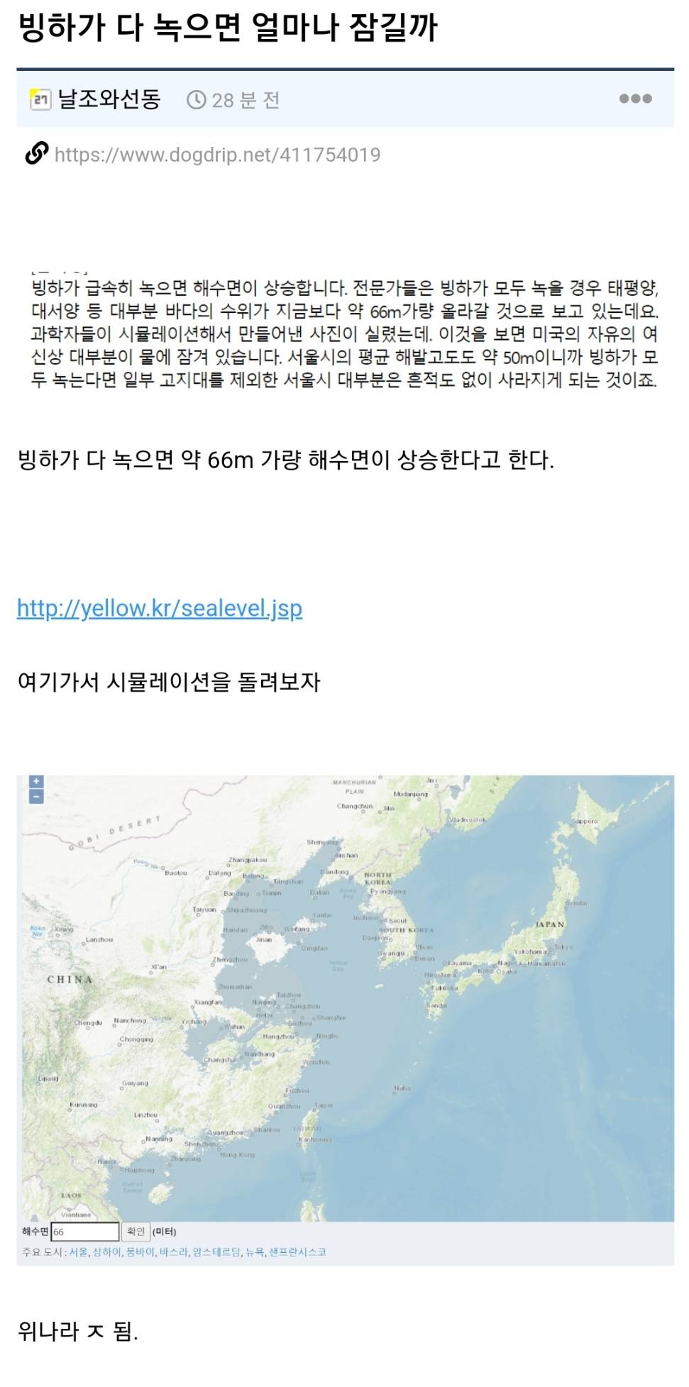 빙하 다 녹여서 해수면 66미터 상승하니 한반도 주변 클린해짐