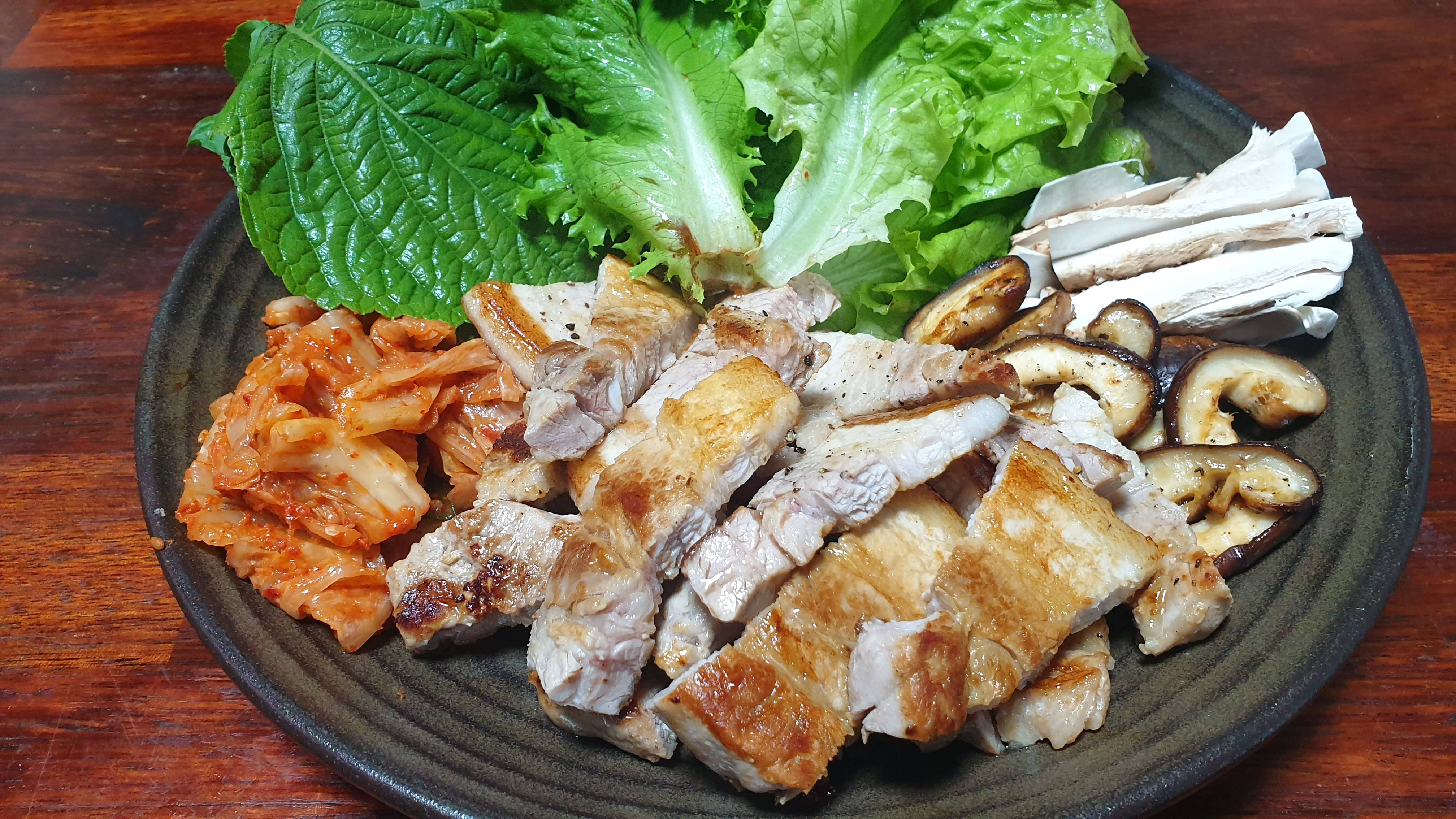 삼겹살에 햇마늘 깐거에다 밭에서 뽑은 야들보들한 상추랑 깻잎