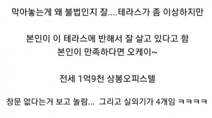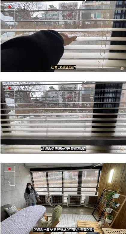 아아 유리가 없단 얘기구나.... 나는 유리가 있는데 여닫질 못한다는 말인줄 알고 진짜 뭔소린가 했네. 저게 실내가 아니라 테라스(베란다구만) 뭐 납득할 수도 있을듯